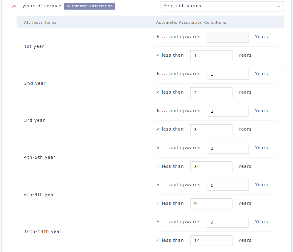 When setting Years of service, choose appropriate settings depending on what you want to count, such as “Nth year since joining” or “completed years of service.”